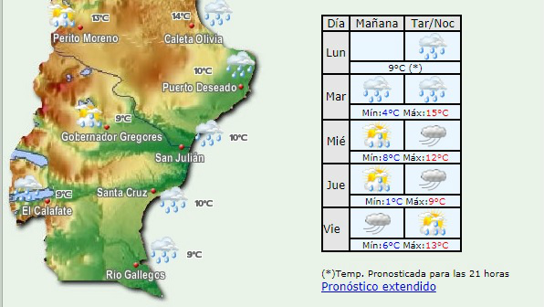 Rio Gallegos | El ente nacional del clima pronostic lluvias y fuertes vientos para toda la semana en Ro Gallegos. Hasta el viernes, segn anuncia el SMN, las precipitaciones sern una constancia. MIRE EL PRONOSTICO EXTENDIDO