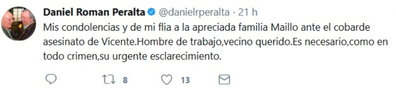 Rio Gallegos | As se expres el ex Gobernador de la Provincia de Santa Cruz Daniel Peralta, en su cuenta de Twitter, por el crimen de Vicente Maillo, quien fue asesinado la madrugada del jueves, en su vivienda de calle Corrientes, tras violenta entradera.