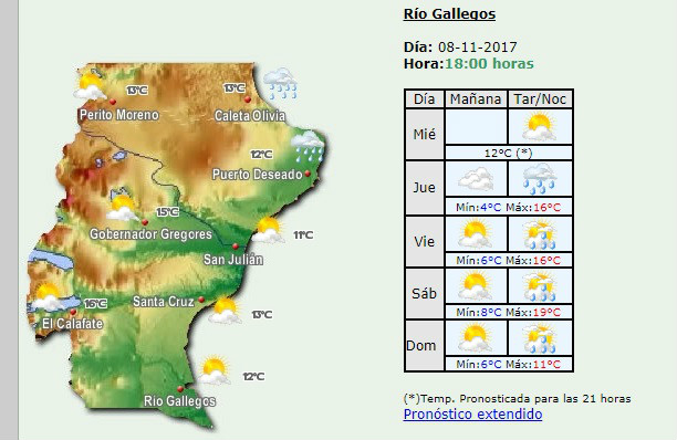 Rio Gallegos | El ente nacional del clima pronostic precipitaciones desde maana jueves ya hasta el domingo para Ro Gallegos. De igual manera, la temperatura estar baja por lo que el fro ser el protagonista. MIRE EL PRONOSTICO EXTENDIDO