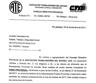Rio Gallegos | La medida de fuerza responde a la falta de una fecha cierta de cobro de haberes del mes de octubre. El paro continuar hasta tanto sean percibidos los sueldos.