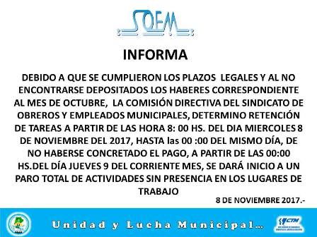 Rio Gallegos | La comisin directiva del Sindicato de Obreros y Empleados Municipales determin retencin de tareas a partir las 08:00 horas de hoy, hasta las 00 horas. De no hacerse efectivo el pago a las 00:00 hs del jueves, se dar inicio a un paro total de actividades.