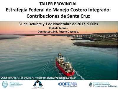 Rio Gallegos | La Secretara de Estado de Ambiente, la Municipalidad de Puerto Deseado, el Consejo Federal de Medio Ambiente y el Ministerio de Ambiente y Desarrollo Sustentable de la Presidencia de la Nacin llevarn a cabo el taller de Estrategia Federal de Manejo Costero Integrado. La capacitacin se realizar los das 31 de Octubre y 1 de Noviembre en el Club de Leones (Don Bosco 1241) de la localidad de Puerto Deseado.