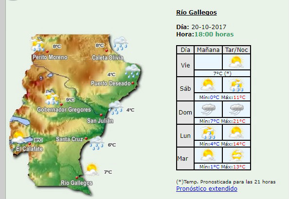 Rio Gallegos | Segn anunci el ente nacional del clima, este fin de semana, habrn lluvias y fuertes vientos para la capital de Santa Cruz. El sbado por la tarde se esperan precipitaciones y durante todo el domingo el viento ser el protagonista. MIRE EL PRONOSTICO EXTENDIDO