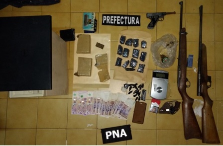 Rio Gallegos | Prefectura encabez cuatro allanamientos en Puerto Deseado, dos personas fueron detenidas y se secuestr: marihuana, cocana, armas, dinero y municiones.