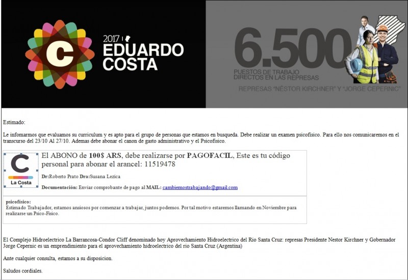 Rio Gallegos | Vecinos de El Calafate y de otros lugares de Santa Cruz recibieron mails en los que les solicitan enviar documentacin para una supuesta preseleccin de personal para las represas, y depositar 100 pesos para el examen psicofsico. Los mails tienen el encabezado de Cambiemos, que mediante un comunicado advirti que se trata de una maniobra fraudulenta.