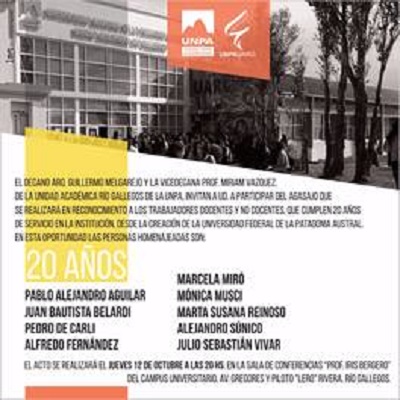 Rio Gallegos | La Unidad Acadmica Ro Gallegos de la Universidad Nacional de la Patagonia Austral y el Consejo Superior de la UNPA reconocern la labor del personal docente y no docente al cumplir 20 aos de servicio. Ser en un acto programado para este jueves 12 de octubre a las 20, en la Sala de Conferencias Prof. Iris Bergero del Campus Universitario ubicado en Av. Gregores y Piloto Lero Rivera de nuestra ciudad.
