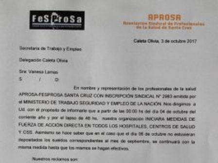 Rio Gallegos | Ante la negativa del gobierno provincial en abrir y sentarse en paritaria, a discutir mejoras y avances para la salud pblica, las asambleas hospitalarias determinaron comenzar una nueva jornada de lucha con un paro por 48 hs, a iniciar este mircoles 4 de octubre en todos los hospitales pblicos, centros de salud y caja de servicios sociales.