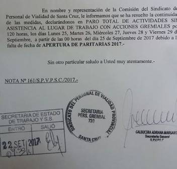 Rio Gallegos | Con fecha de hoy, 22 de septiembre el gremio que rene a los trabajadores de Vialidad Provincial notific de una nueva media de fuerza de 120 horas.