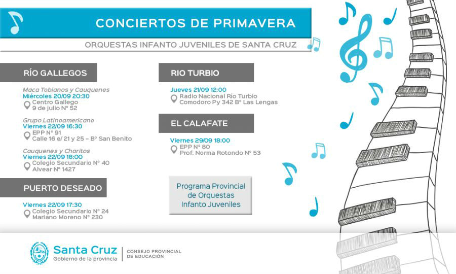 Rio Gallegos | El Gobierno de Santa Cruz, a travs de la Direccin General de Educacin Artstica y del Conservatorio de Msica del CPE, promueve la formacin musical de los alumnos a travs del Programa Provincial de Orquestas Infanto Juveniles. Durante los prximos das las distintas formaciones de Santa Cruz brindarn conciertos para celebrar el comienzo de la primavera y el Da del Estudiante.