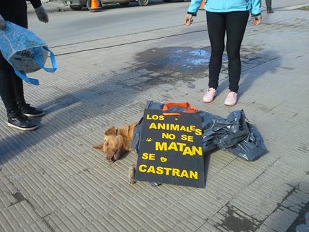 Rio Gallegos | Hoy vecinos se acercaron al mstil mayor de la ciudad de Ro Gallegos, para mostrarle al intendente lo que ocurre en algunos barrios de la ciudad, con la matanza indiscriminada de canes, mediante el uso de veneno. Para ello, trajeron envuelto el cuerpo de un perro, segn ellas para que el intendente vea con sus propios ojos el problema-, pero se les solicit que cubrieran al animal muerto.