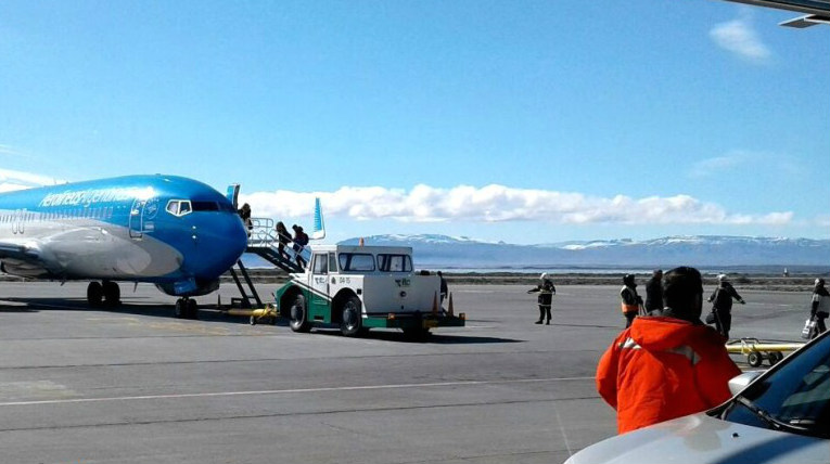 Rio Gallegos | Los Bomberos del aeropuerto debieron realizar acciones de prevencin para contener a pasajeros que ascendan y descendan de los aviones ya que no se pudo utilizar la manga que habitualmente se despliega para pasajeros.