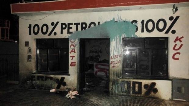 El local de la lista roja 100 por 100 petroleros result con daos materiales al ser alcanzado por un lquido inflamable encendido que le arrojaron desde el exterior; personal de bomberos alertado por los vecinos, lleg de inmediato y logr extinguir las llamas.