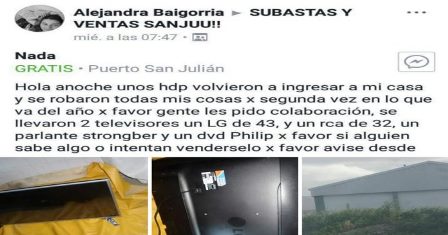 Rio Gallegos | El martes por la noche delincuentes ingresaron en un domicilio ubicado en Pasaje Jorge Stich, de la localidad de Puerto San Julian, alzndose con dos televisores LCD y otros artculos electrnicos. Es la segunda vez en el ao que esta vecina sufre esta situacin, ya que en el mes de enero le desvalijaron la casa.