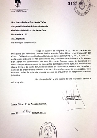 Rio Gallegos | El Presidente del Honorable Concejo Deliberante Javier Aybar se present ante la Justicia Federal para solicitar informacin sobre las investigaciones y las posibles causas que estaran enfrentando integrantes del Ejecutivo Municipal, y a su vez corroborar fehacientemente que sea cierto que durante el allanamiento suscitado esta maana en la comuna local, hayan sido pedidos y entregados los expedientes sobre la venta de Tierras que justamente tenan que presentar horas ms tardes los secretarios de Hacienda y Planificacin en la sesin del Concejo Deliberante.
