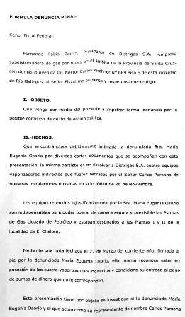 Rio Gallegos | En 2014, Potrank Argentina fue declarada en concurso preventivo de acreedores. Su dueo, Carlos Parsons, cedi su potestad como contratista a Mara Eugenia Osorio. Desde ese lugar, la fabricadora de tanques de almacenamiento de petrleo reclama a Distrigas el pago de una deuda contrada antes de diciembre de 2015 y sin respaldo alguno de documentacin. Ahora su contratista condicion la cancelacin de esa deuda a la devolucin de maquinaria del Estado, por lo que la empresa provincial present una denuncia penal por la posible comisin de delito de accin pblica.