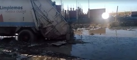 Rio Gallegos | Vecinos que viven en ese sector de la ciudad de Ro Gallegos se quejan ante la acumulacin de agua en esa esquina que genera humedad en el interior de las viviendas y que adems impiden el normal trnsito, prueba de ello fue el atascamiento de un camin recolector de residuos perteneciente a la municipalidad.
