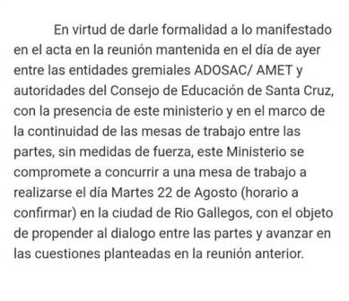 Rio Gallegos | La resolucin es hasta el mircoles que viene, a la espera que se cumpla con lo expresado por Nacin y Provincia en ltimo encuentro en Buenos Aires, este 15 de agosto pasado.